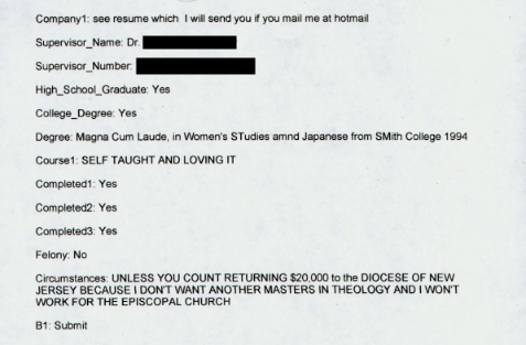 (Note from JSP: This was received the other day at the company where I work. We have an online form by which one can apply for a job - this particular one was printed out and handed to me by my boss, who decided I needed to see it - and he was right. I'll save the major explanations for a moment, but have a look - obviously I blacked out anything that could identify her or us, but other than that have done no editing - this is a serious job application. She was not kidding.)
